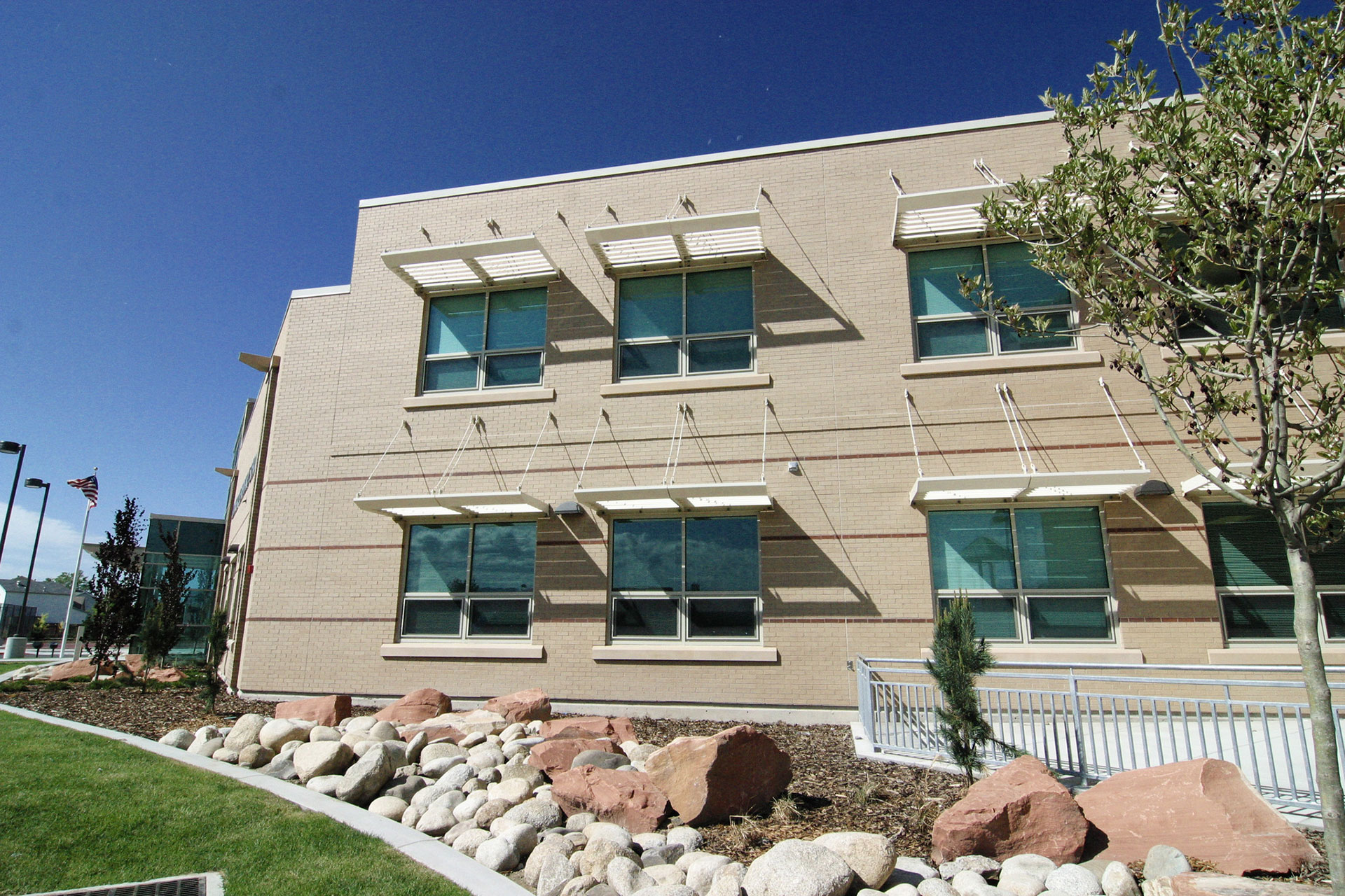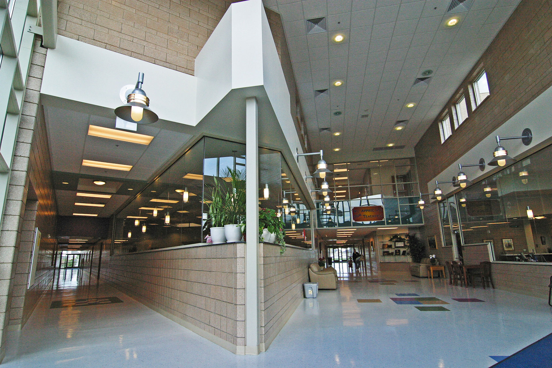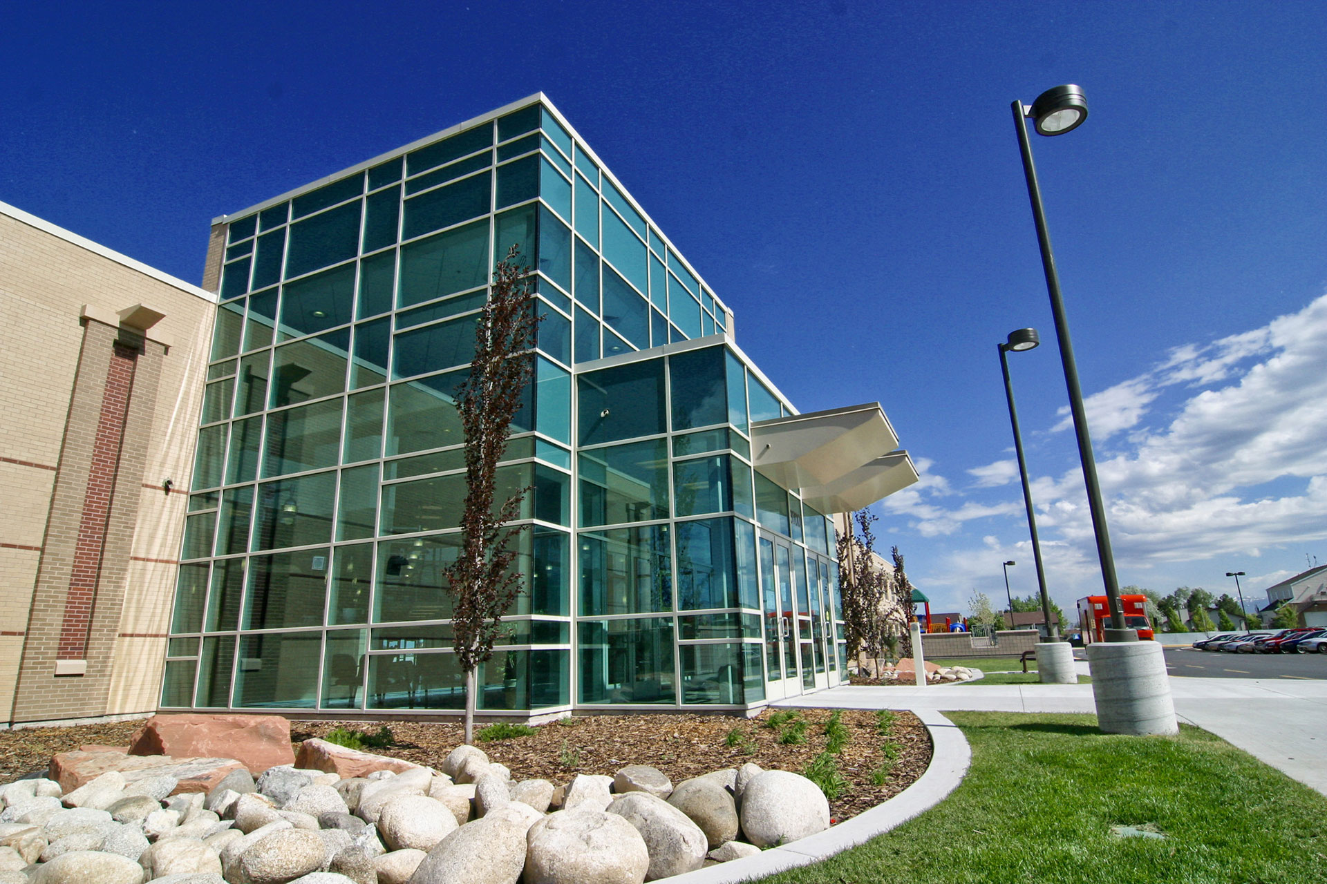 Granger Elementary accommodates 900 Students. With children’s development as a priority, details that enhance learning were necessary. Aesthetically, the main entrance welcomes students and visitors alike to this unique learning facility. With a high ceiling, comfortable seating, and an abundance of glass and windows the entry is a delightful place to be. A low sill height and windows free of mullions in the main office allow the office personnel good visual control over people entering and leaving the school.